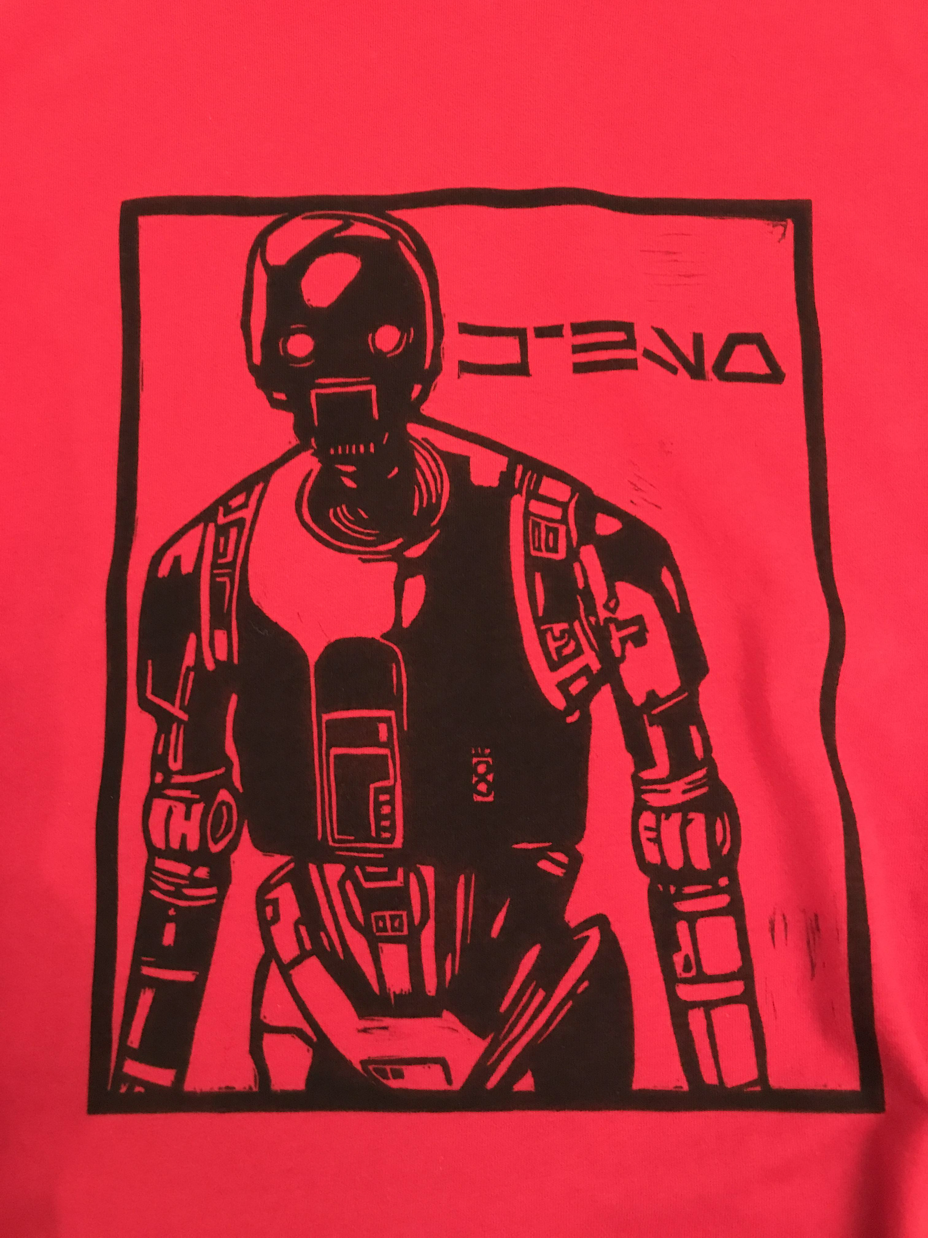 Design for relief print shirt. Design was carved from a linoleum block and printed onto shirt through the use of a press. Type on shirt is in the Star Wars language Aurebesh and is the name of the Droid.